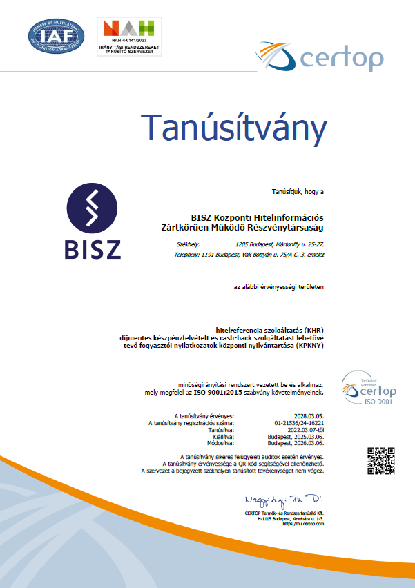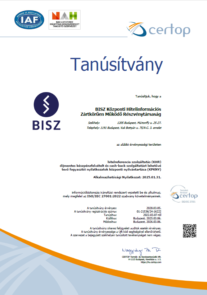 A Társaság az ISO 9001 és az ISO/IEC 27001 szabványok követelményeinek megfelelő integrált minőség-, és információbiztonsági irányítási rendszert működtet, amely garantálja, hogy folyamatosanmagas színvonalú szolgáltatásokkal álljon az adatszolgáltatók rendelkezésére és szolgáltatásainak körét úgy alakítja, hogy megfeleljen a jogszabályi előírásoknak és a lehető legjobban illeszkedjen az adatszolgáltatók elvárásaihoz. Az adatszolgáltatói igények alakulásáról a Társaság naprakész információkkal rendelkezik, ennek megfelelően folyamatosan keresi a minőségi megoldásokat és a hatékonyabb munkavégzés módjait, valamint a megfelelő és arányos védelmi intézkedéseket, amelyek megfelelően biztosítják a Társaság által működtetett adatbázisokban lévő adatok, információk, valamint a szervezet adatainak, információs eszközeinek védelmét a külső és belső fenyegetésektől, akár szándékosak, akár véletlenszerűek azok. Ezért a Társaság az informatikai biztonságot (bizalmasság, sértetlenség, rendelkezésre állás) veszélyeztető fenyegetettségeket felméri, a kockázatokat meghatározott módszertan szerint elemzi, folyamatosan felülvizsgálja, és védelmi intézkedéseket alkalmaz bekövetkezésük elkerülésére.